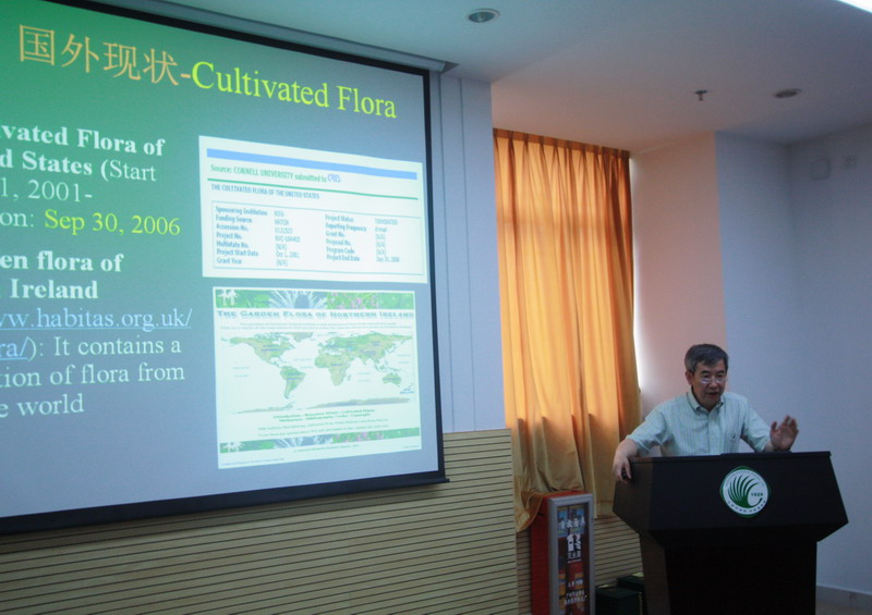 华南植物园主任黄宏文研究员首先作了《迁地栽培植物志》的报告,他对我国植物多样性及迁地栽培概况、《迁地栽培植物志》的目的和意义、国外编研现状、可行性分析、目前积累及进展、以及初步编研计划等六个方面进行了详细介绍。他在报告中表示,该志将依据物种的“个体、群体实地栽培性状的客观性、用途的适用性、基础数据的服务性”为指导思想;立足植物园引种栽培的客观个体、群体和物种的生物学特征信息、物候信息、栽培繁殖信息及利用价值信息的收集整理,充分体现分类信息和引种采集信息;书中包含大量各类植物的茎、叶、花、果、种等彩图;将以指南招标与专家推荐相结合方式进行编研,以科及重要属成卷(册),对现有迁地栽培大于100种的科和特殊类群(如水生植物、小科归并等)进行编册,初步预计成册80-100卷(册),计划耗时10-20年。黄宏文强调,迁地栽培植物志的编研将充分利用植物园“同园”实地观察比较的优势,为植物分类学和基础植物学的深入提供丰富翔实的活体植物生长发育特征数据,并可以促进植物相关产业的发展。