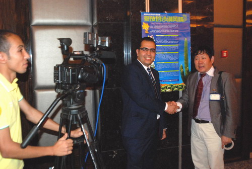 埃及新闻发布会现场(中国文化参赞陈冬梅 右1、广州市旅游局副局长李志新 右2、埃及旅游部副部长纳赛尔 右3、中国文化参赞刘天明 右4、华南植物园蒋厚泉 右5)