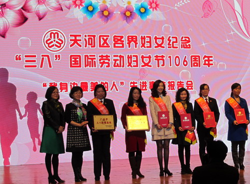 随后,大会为获得省、市、区妇联表彰的先进个人(集体)代表进行了颁奖,周艾蓉荣获了广州市“三八红旗手”和十大“优秀书香家庭”两项殊荣。