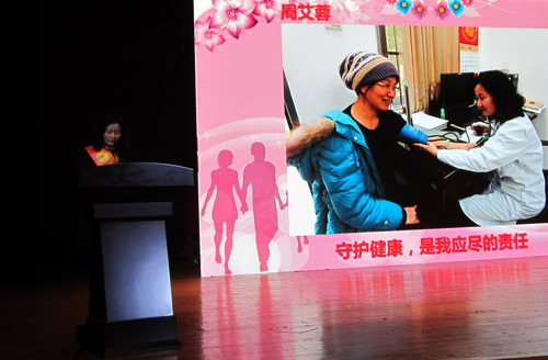 在随后的先进报告会上,周艾蓉作为大会特邀的四个获奖代表之一,作了先进事迹报告。报告以《守护健康,是我应尽的责任》为题,讲述了自己从事医护工作20年多来的体会与感悟。她指出,长年工作在临床第一线,要不断扎实理论基础,丰富临床经验,待患者如亲人,才能得到病人及家属的信任和肯定。报告充分展示了当代职业女性的担当与风采,引起了参会人员的强烈反响。