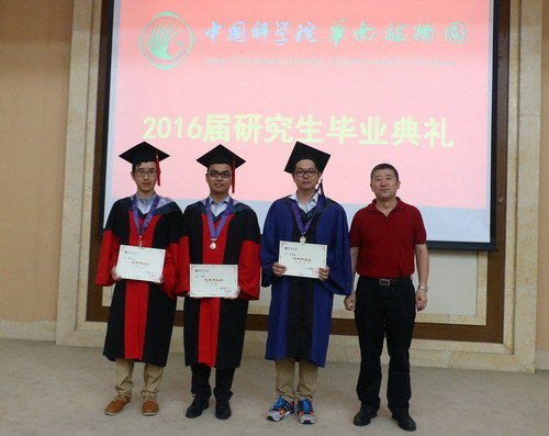随后,赖志敏部长介绍了2016年研究生学位论文答辩、学位申请、毕业生在学期间获奖情况以及就业签约情况等。紧接着,蒋跃明副主任宣读了2015年度国家奖学金、2015-2016学年中国科学院大学优秀毕业生、三好学生名单以及企业奖学金(普邦园林奖学金、BIOMIGA奖学金)获奖研究生名单。任海主任、张福生副书记、蒋跃明副主任、广州普邦园林苗木事业部总经理曾凤女士、嘉兴蓝诺盛生物科技有限公司商务部经理言国英女士,分别为获奖学生代表颁发证书,并合影留念。