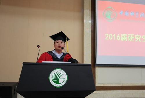 李涛涛作为毕业博士生代表进行了发言。他对所有老师、领导多年来的关心和指导表示衷心的感谢,对各位同窗顺利完成学业表示热烈的祝贺。他对自己五年的科研生活感慨万千,其中感触最深的是感恩和责任。他说导师的包容和言传身教,让他在科研和为人处事上得到了极大的提高;而植物园几年的学习,尤其是博士期间的经历,使得他对生活、科研、事业、对人生有了新的更深刻的解读。强烈的责任感也将永远是他判断、决策和行事的准则。