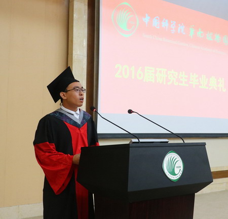 吴靖滔作为毕业硕士生代表,就自己硕士三年学习的过程与经验同大家进行了分享,希望能给大家一些启发与建议。他在感谢父母,感谢导师,感谢课题组的师兄师姐和身边的同学朋友的同时,更感谢中科院华南植物园这一个平台,让他在科学研究的道路上无怨无悔。