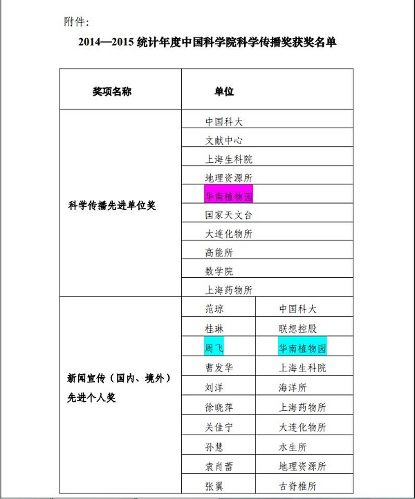 为鼓励在中国科学院科学传播工作中做出突出成绩的集体和个人,科学传播局、国际合作局和监督与审计局,共同组织开展了2014局、国际合年度中国科学院科学传播奖的评选工作,经评审工作领导小组审定,中国科学院科学传播局于近日颁发《关于表彰2014-2015年度中国科学院科学传播获奖单位和个人的通报》(传播字﹝2016﹞4号)”。中科院华南植物园荣获“科学传播先进单位奖”;同时周飞同志荣获“新闻宣传先进个人奖”、宋政平同志荣获“科学传播先进个人奖”。