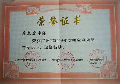 为认真贯彻落实习近平总书记重要指示精神,重视家庭建设,注重家庭、家教和家风,推进家庭文明建设常态化,广州市妇女联合会、精神文明建设委员会办公室联合开展寻找“最美家庭”系列活动,引导群众珍视亲情、传承美德。综合运用网络、报刊、广播电视等媒体评选。5月23日,“广州市2016年文明家庭”入选名单正式公布,中科院华南植物园周艾蓉、蒋厚泉家庭名列其中,获此殊荣。