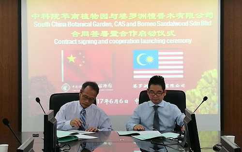 6月8日,中国科学院华南植物园与马来西亚婆罗洲檀香木有限公司(Borneo Sandalwood Sdn Bhd)关于檀香(印度白檀)规模化育苗及栽培技术合作签约仪式在植物园举行。华南植物园马国华、吴坤林研究员,科技促进发展中心主任王克亚及马来西亚婆罗洲檀香木有限公司Richard Ngau Jok Uloi等领导共同出席了签约仪式。