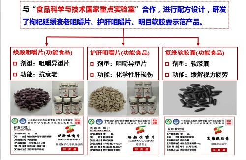 基于枸杞的成分及其功效研究基础,研发了同步制备枸杞活性物质的新工艺2项,形成了高附加值的保肝、延缓衰老、缓解视力疲劳的功能产品3项,该技术和产品已经转化至合作企业;研发枸杞玻态产品2项;建立标准操作规程7项、工程化技术方案6项。建立企业标准6项,其中3项获得宁夏卫生和计划生育监督局备案。这些产品的研发为枸杞深加工领域丰富了高附加值产品,有巨大的市场潜力。