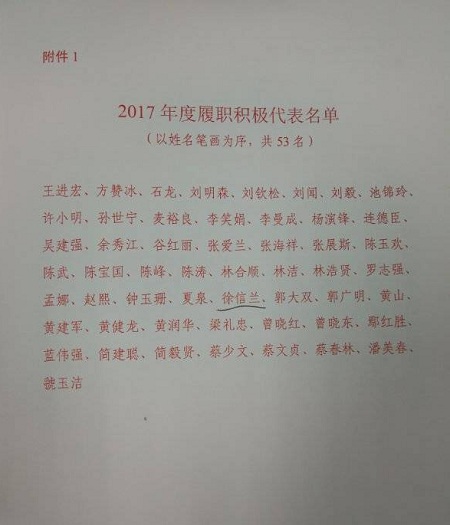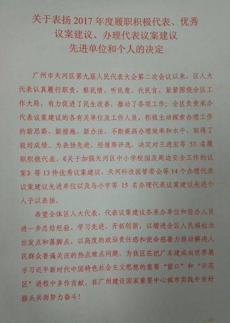 会上,广州市天河区人大常委会表彰了2017年度履职积极代表和工委组成人员、优秀提案建议、办理代表议案建议先进单位和个人。其中徐信兰荣获2017年履职积极代表,受到大会表扬。