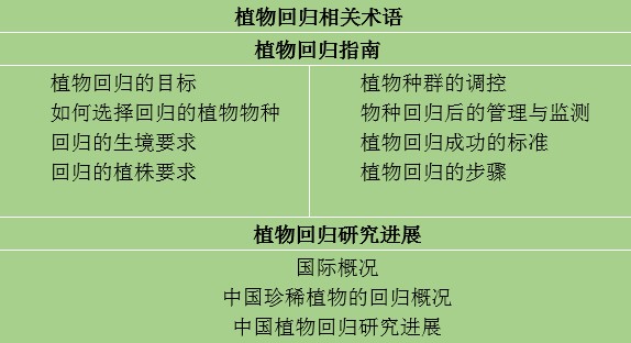 该专著介绍了开展植物调查和采集,进行科学研究并积极开展濒危物种回归自然及其管理工作是植物园使命的延展。近500年来,特别是最近50年,植物园活植物收集逐步在生物多样性保护中发挥积极作用。在生物多样性丧失日趋严重的全球背景下,迫切需要植物园发展各种栖息地恢复技术,加强植物群落、居群和物种保护的主动管理。植物园可与自然保护区合作,将退化生态系统和自然保护区的缓冲区及其周边地区作为物种回归或异地保存的主要场所,实施物种恢复计划,开展植物繁殖、回归、物种补充和迁移,以及破损或退化栖息地的恢复,争取良好的社会、生态和经济效益,在珍稀濒危植物保护和利用中发挥更广泛的作用。