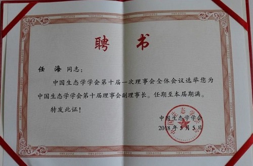 5月5日,中国生态学学会第十次会员代表大会在南京举行。会议选举产生了150位理事,50名常务理事,10名副理事长和1名理事长。中科院生态环境研究中心研究员欧阳志云当选为理事长,中科院华南植物园任海研究员全票当选为副理事长。在随后召开的十届一次常务理事会上,确定任海同志负责学会的学术交流工作,负责联系中国生态学学会的海洋生态、淡水生态、红树林生态专业委员会,负责联系东南片区的高校院所和省级生态学学会的工作。