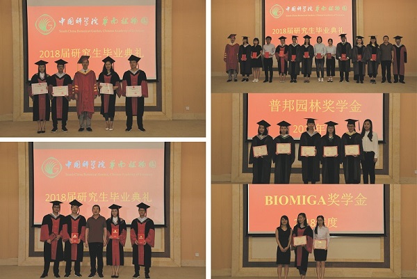 接着人事教育处赖志敏副处长介绍了2018年华南植物园研究生毕业生情况。蒋跃明副主任宣读了本年度国家奖学金、优秀毕业生、三好学生名单以及普邦园林奖学金、BIOMIGA奖学金获奖研究生名单。园领导及企业嘉宾为获奖学生颁发荣誉证书并表示祝贺。