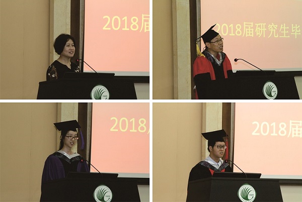 张明永研究员代表全体研究生导师发言,他对大家的毕业表示祝贺,并希望同学们在未来的道路上能够继续弘扬“绿叶情操、细根精神、木棉风采”。郑棉海和周丽梦同学分别代表博士和硕士毕业生发言,通过分享在华植学习期间科研、生活上的有趣而难忘的经历,表达了他们对华植、对导师的不舍,并且对园领导及老师们为华植学生们提供的理想的科研和生活环境表示感激,献上了自己对华植美好的祝福。