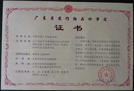 10月31日获悉,中科院华南植物园段俊研究员及科研团队与广州双春生物科技有限公司合作选育的药用植物“中科双春1号铁皮石斛”(Dendrobium officinale "Zhongke 1"),通过了广东省农作物品种审定会议的审定(审定编号粤审药20180003)。这是华南植物园选育的第6个通过审定的铁皮石斛新品种。