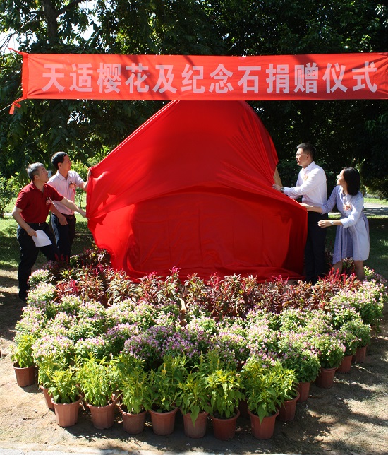 为祝贺中国科学院华南植物园90华诞,企业向华南植物园捐赠樱花及纪念景石揭幕仪式于9月20日在植物园科研区和展示区分别举行。天适集团向华南植物园捐赠了20株广州樱和2块纪念景石,董事长何宗儒及部分企业领导出席揭幕仪式。华南植物园主任任海、党委书记/纪委书记张福生,及相关部门负责人、职工和在读研究生代表参加了活动。活动由张福生主持。