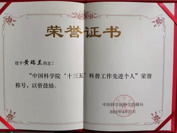 4月26-29日,2021年中国科学院科普培训大会在上海顺利召开。为表彰先进,激励广大科普工作者进一步做好新时代科学技术普及工作,科学院传播局评选出15家先进单位以及40名先进个人进行表彰。我园园艺中心科普旅游部副部长黄瑞兰荣获全院“十三五”科普工作先进个人。