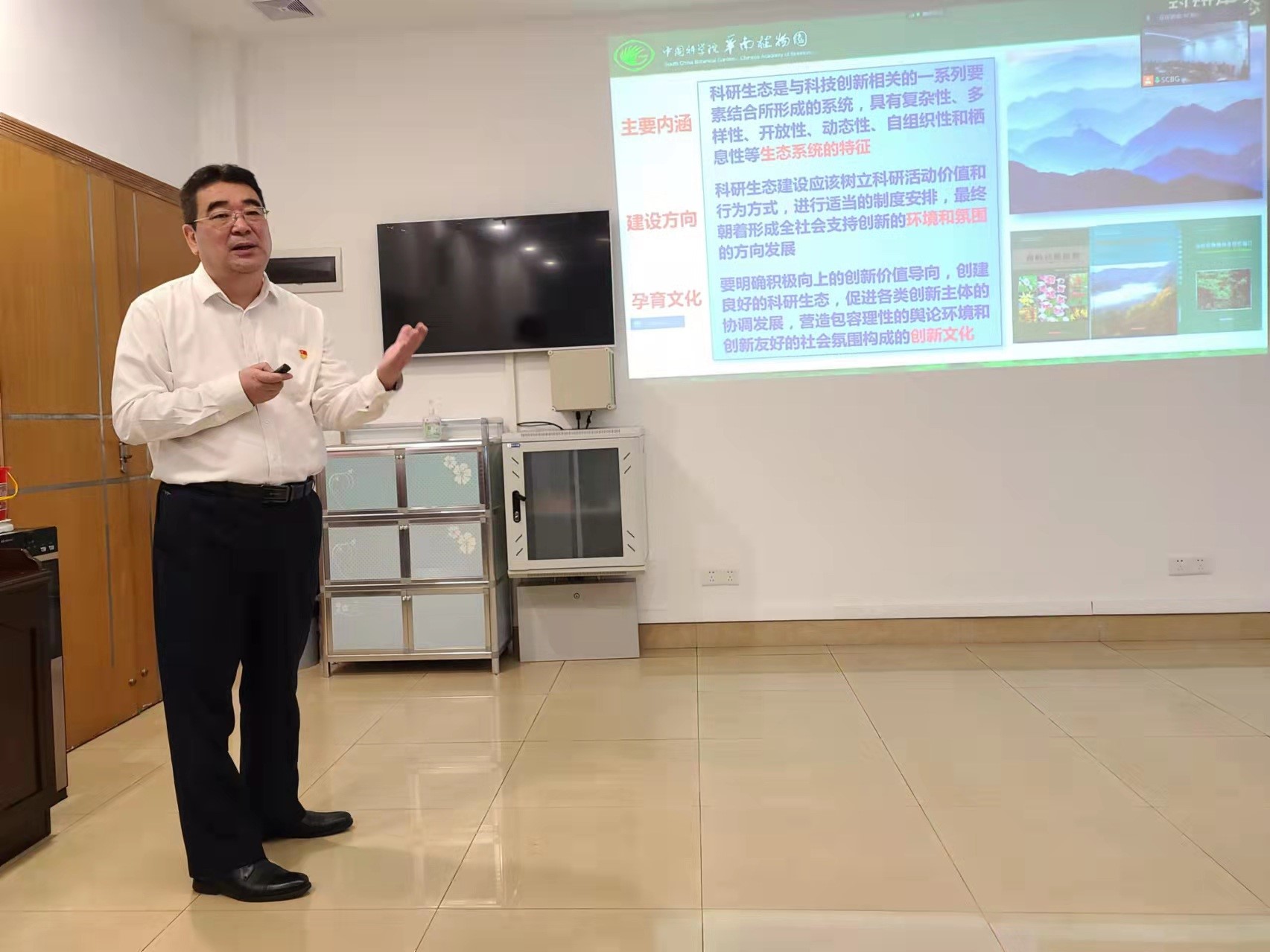 会上,党委书记/副主任魏平作《弘扬科学家精神,营造良好的科研生态》报告。报告从贯彻落实习近平总书记重要指示批示精神和重要讲话精神、新时代科学家精神内涵、中央及院党组关于弘扬科学家精神的决策部署和工作举措、如何传承好华南植物园老科学家精神等四个方面,带领大家系统学习了习总书记关于中国共产党人精神谱系的重要论述、在2021年“科技三会”上的重要讲话精神,以及视察中国科学院时的重要讲话精神和重要指示批示精神;介绍了新时代科学家精神6个方面的内容,强调科学家精神和“两弹一星”是中国共产党人精神谱系的重要组成部分,承载着党的初心使命,呈现出党的鲜明政治品格,作为国家战略科技力量主力军,必须传承光荣传统,胸怀“两个大局”、心系“国之大者”;通报了2018年以来中国科学院科研道德委员会关于学术论文署名、恪守科研伦理、科研活动原始记录、发布学术成果等6份诚信提醒或负面行为清单的主要内容,警示科技工作者要珍惜学术荣誉、抵制学术不端行为;报告以陈焕镛、张肇骞、陈封怀、何绍颐、黄吉祥、余作岳等老一辈科学家为例,阐述了华南植物园人的优良传统和科学家精神,提出了启动“华南园奋斗者”创新文化建设活动的工作举措。