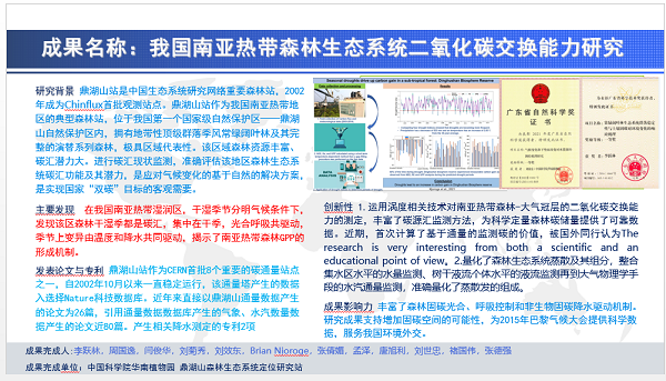 南亚热带森林生态系统碳汇功能显著,对实现“碳达峰“和“碳中和”(双碳)、以及应对气候变化具有重要作用。鼎湖山站从2002年10月开始,持续20多年来以南亚热带典型生态系统为研究对象,利用涡度相关技术开展了森林生态系统二氧化碳交换能力研究,基于长期大气和林冠界面二氧化碳交换量的长期监测和生物量调查,科学定量南亚热带森林生态系统的碳汇功能,揭示了森林生态系统碳汇调控机制及其对环境变化的响应。之前该成果部分获得了《广州日报》(2022年12月1日)报道,成果为“双碳”计划实施提供了科学数据,有着重要的政治、经济、生态意义。
