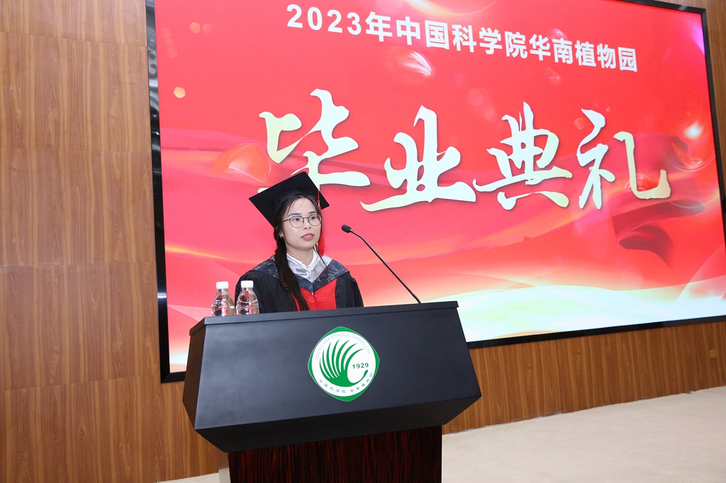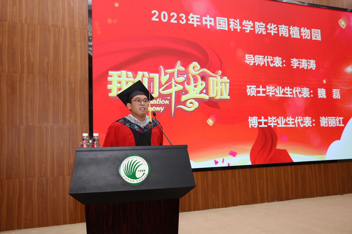 硕士毕业生魏磊和博士毕业生谢丽红分别发言,他们代表毕业生感谢母校提供的一流学习环境和科研平台及老师们的精心培养,表示未来将铭记“绿叶情操、细根精神、木棉风采”,在所到达的地方播种新的梦想种子,生根、发芽、大放异彩。