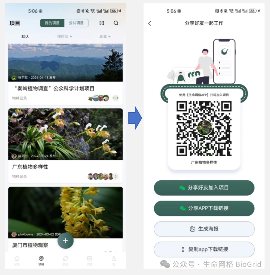 图1. 个人项目和项目二维码:个人已加入的项目列表(左),APP生成的项目二维码,用户可以同时加入多个项目,可以将单条观测记录同时提交到不同的项目(右)。