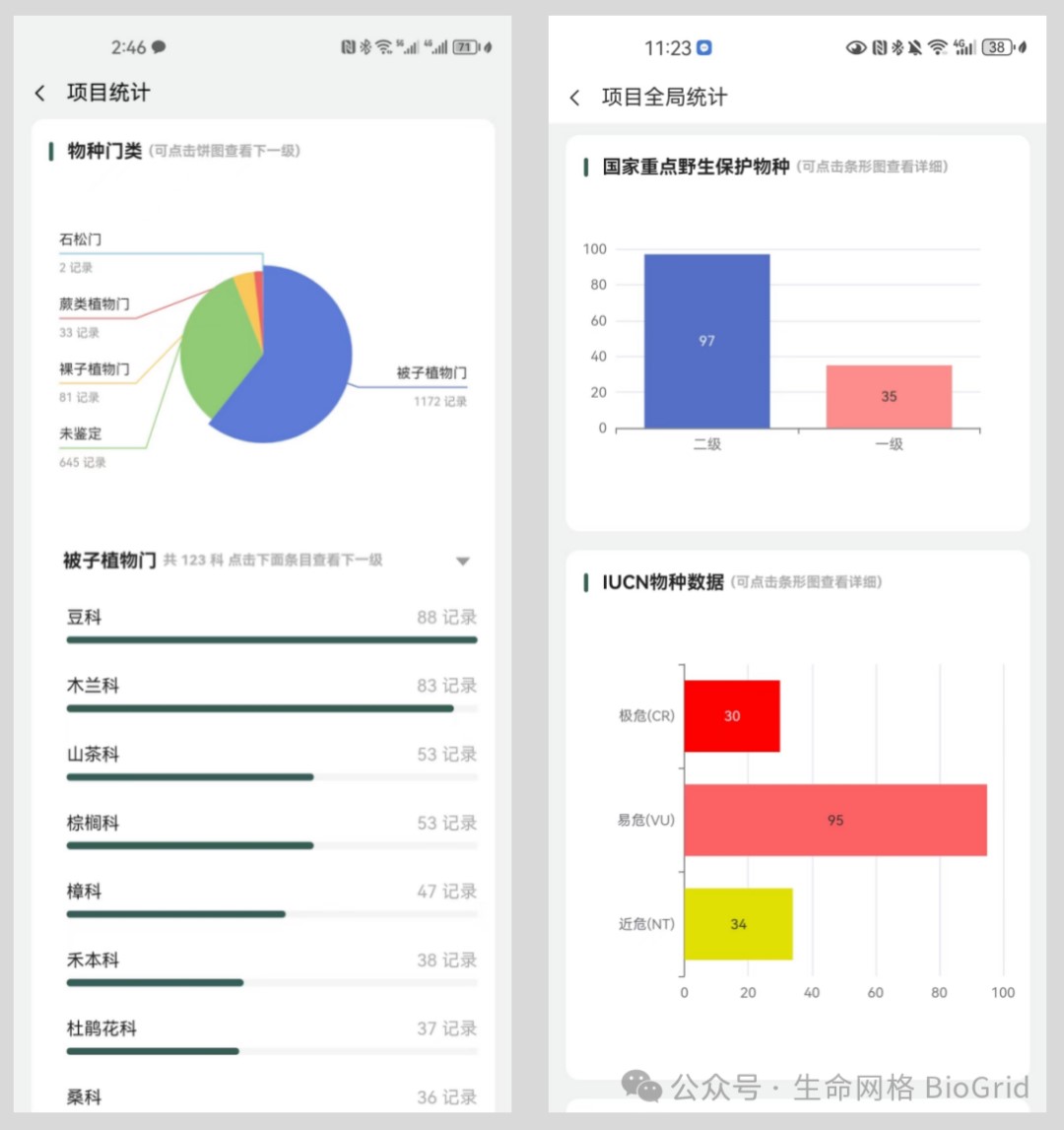图2. 实时分析和统计项目数据:项目对成员提交的数据按照分类群归类统计(左),项目会自动统计数据中国家重点野生保护物种和红色名录物种的情况(右)。