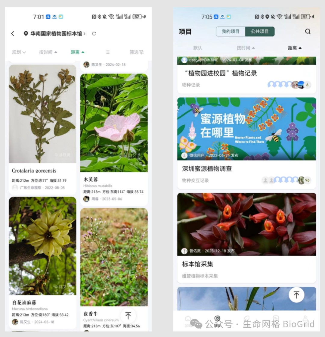 图5. 局地感知:距离当前用户最近的物种观测记录列表(左),距离当前用户最近的公共观测项目(右)。