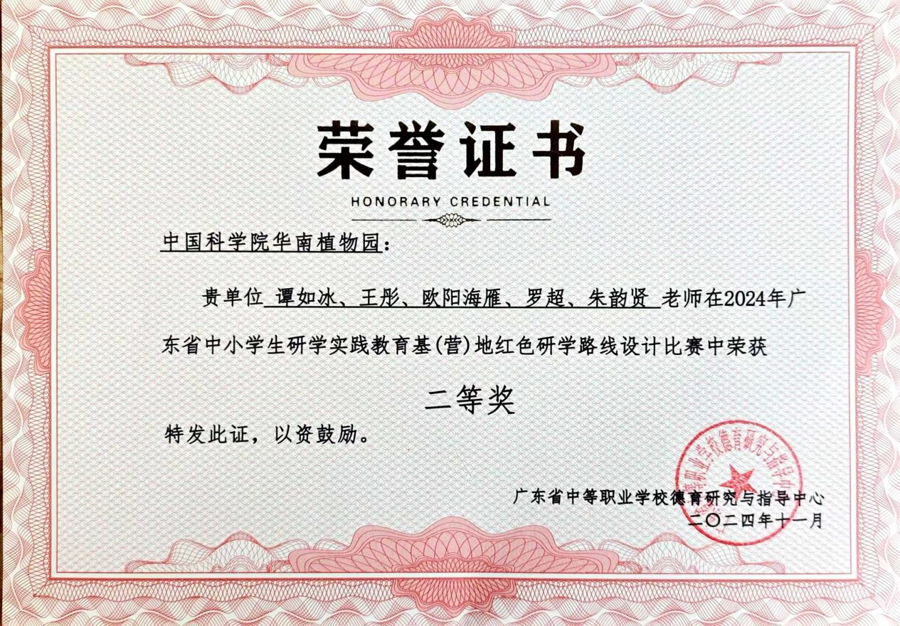 近日,2024年广东省中小学生研学实践教育基(营)地红色研学路线设计设计大赛颁奖仪式在韶关丹霞山举行,中国科学院华南植物园红色研学路线荣获二等奖。