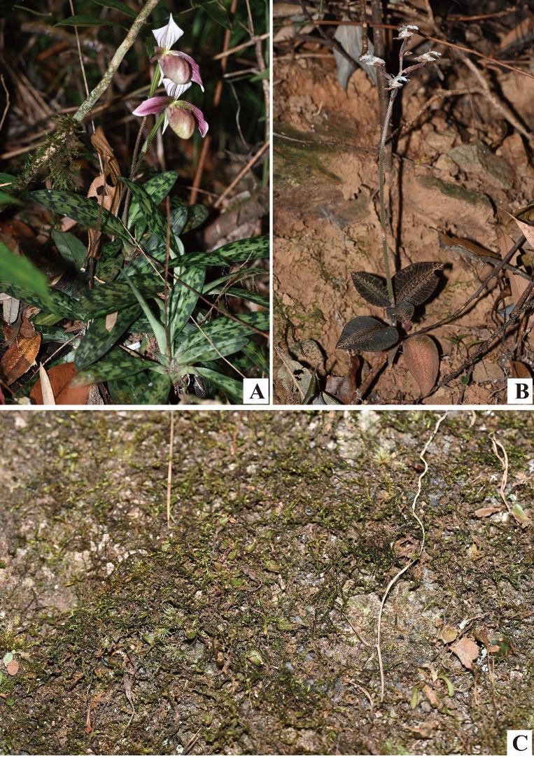 绽放中的紫纹兜兰(Paphiopedilum purpuratum, A)和金线兰(Anoectochilus roxburghii, B)以及休眠中的独蒜兰属植物(Pleione sp., C).