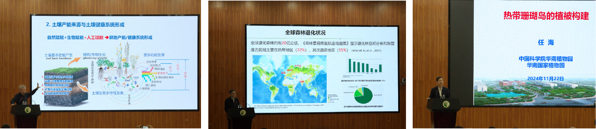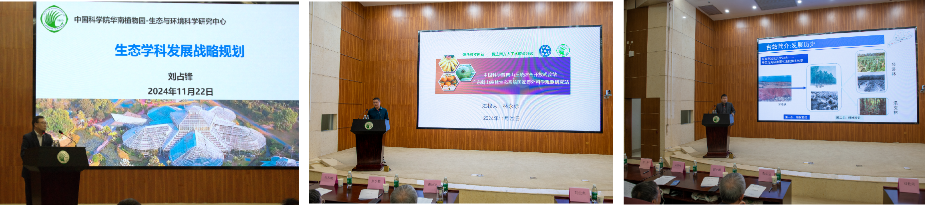 主旨报告(从左至右:张佳宝院士、刘世荣院士、任海主任)主题报告
